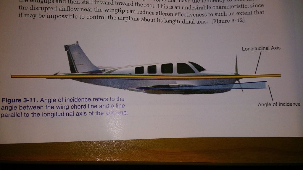 在飛機設計好後,機翼必須安裝上機身。通常來說呢,機翼應該安裝在機身兩側,然後機翼的chord line弦線稍微往上揚一些,剛好與relative wind有個夾角,這個角度就叫angle of incidence。可以想像作是還沒有拉機頭時,飛機設計上本來就有的些微angle of attack。