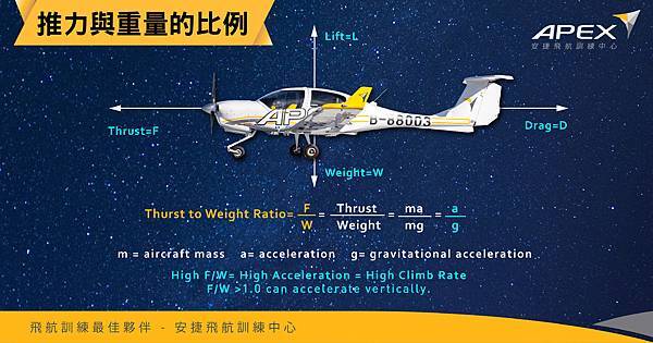 #推力與重量的比例 會影響該架飛機的航程與酬載,是航空公司於機隊規劃的參考依據之一。 推重比越大,航機運用的空間越大。 http://www.apexflightacademy.com/